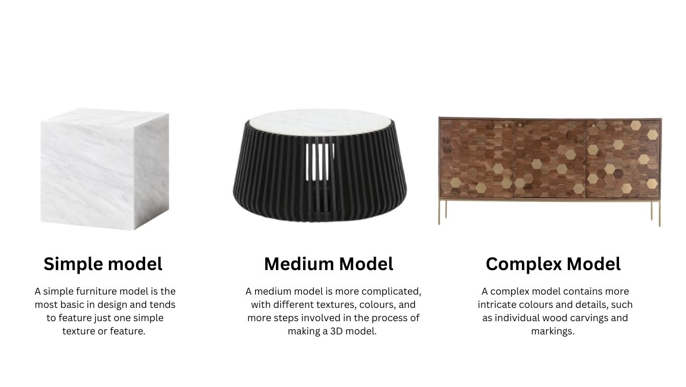 A simple, straight-lined wooden dining table is relatively quick and easy to model. Whereas, a Chesterfield sofa, requires hours of detailed 3D modelling, from the leather folds to the stitching and buttons. These intricate elements take time, skill, and precision.