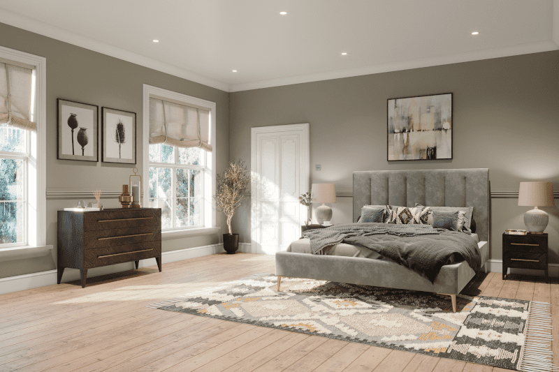 Creating a 3D scene based on the customer’s approved style concept is a collaborative effort between our CGI artists and interior stylists. The process begins with the approved floor plan as a foundation, where our CGI artists first construct the architectural elements of the room, such as doors, windows, skirting, and coving, according to the room’s style. Initially, the room is modelled as a clay scene, focusing purely on the geometry without textures or lighting. Once the structure is in place, textures are applied to all surfaces, bringing materials like wood, fabric, and stone to life. The interior stylist then works closely with the CGI artist to accurately position furniture, accessories and decor elements within the scene.